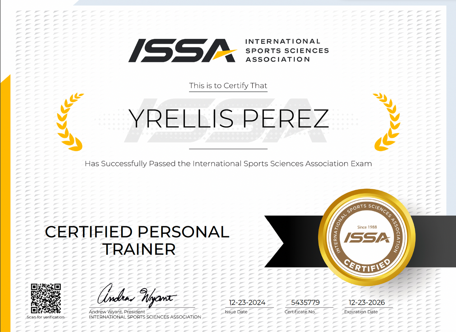 Con mi certificación como Personal Trainer por ISSA, estoy aquí para ayudarte a alcanzar tus metas de forma segura, efectiva y personalizada. Este logro es solo el comienzo de todo lo que puedo ofrecerte para transformar tu bienestar. ¡Vamos con todo! ✨